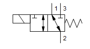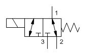 3 ports, port 1 to 2 open, port 3 blocked, direct acting, 3-way