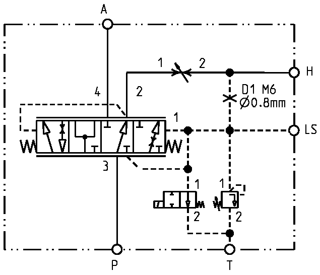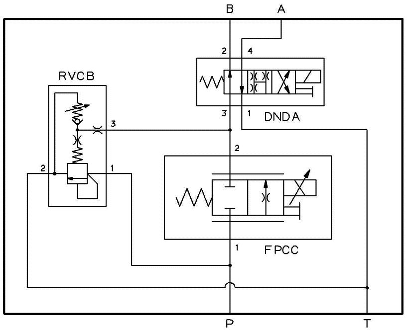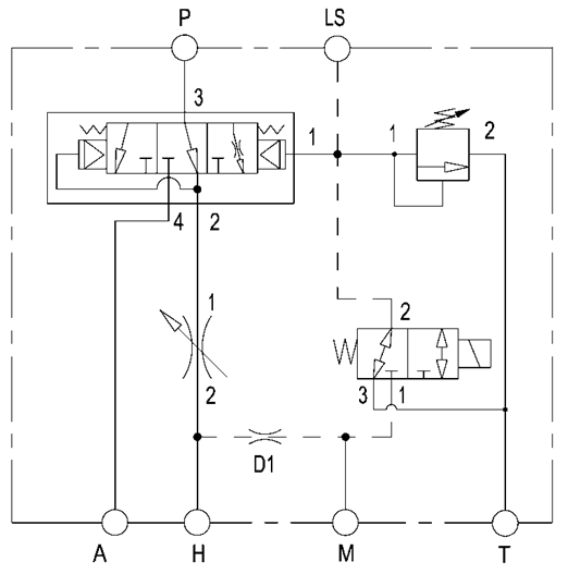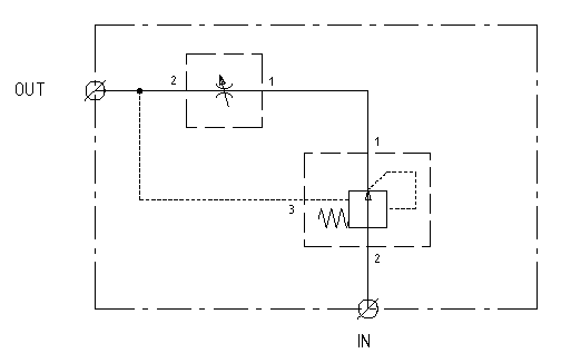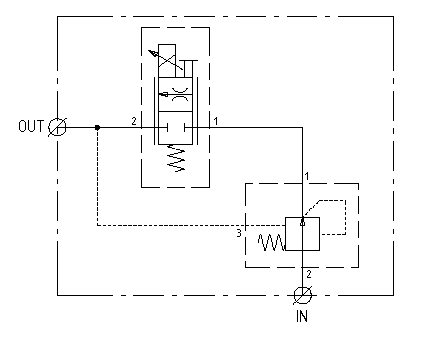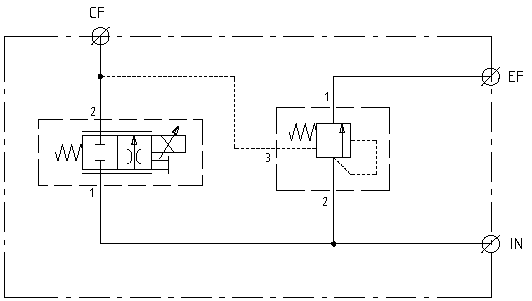 Kretsen fungerar så att ventilen kompenserar för en förändring i lastnivå så att flödet ska kunna regleras utan påverkan av lasten. Man styr flödet med aningen manuell strypventil eller med en elektrisk proportionalventil.